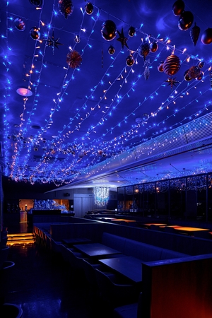 地上200mに位置し、絶景を一望するレストラン「スカイビュッフェ51」でのイルミネーションビュッフェは、弁天町の冬の風物詩として毎年多くのお客様にご好評をいただいております。第3弾となる今回は、Z世代を中心にSNSで話題の“ウィッシュコア”の世界観に着目し、羽を休めた天使たちが開く、きらめくパーティー会場をイメージしました。青・黄・紫を基調にした約10,000球のイルミネーションが輝く店内には、羽や星、月のモチーフ、そして大小のミラーボールが点在し、まるで夜空に星々が瞬くような光に包まれます。中央のビュッフェコーナー上には、光の雨を纏わせたような逆三角形のオブジェと、天使の羽をかたどったLEDライトがきらきらと重なり合い、空間全体を象徴するアイコニックな光のオブジェとして存在感を放ちます。さらにスイーツコーナーには、雲の上にいるかのようなふわふわとした装飾や、天使たちのパーティーを思わせるきらびやかな小物を配し、幻想的で心ときめく世界観を演出しています。