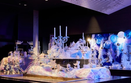 店内の装飾グリーンは、青系のポインセチアと雪が積もったような枝ぶりを組み合わせ、青・ライトブルー・シルバーのボールオーナメントで彩り、冬らしい清らかさを感じる空間に仕上げました。また、店内入口にはクリスマスツリーを設置し、明るく和やかな雰囲気でお客様をお迎えいたします。