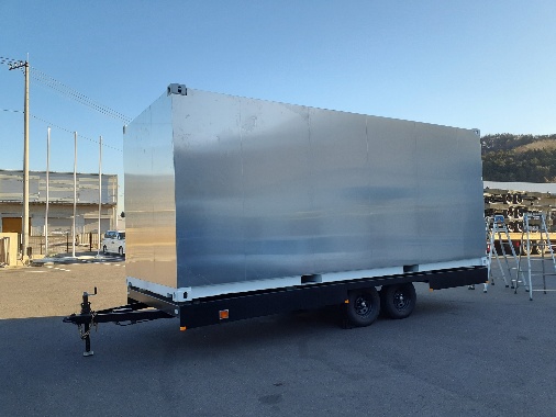会場内でリユース(中古)トレーラーの販売も行ないます。シャーシと20ft中古コンテナを組み合わせたトレーラーです。トレーラーハウスのベース車としても使えますし、コンテナを倉庫として利用し、建築物に該当しない保管スペースにも最適です。
