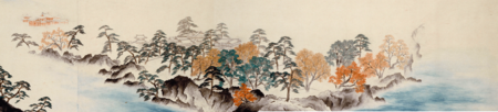 横山大観最後の絵巻物《四時山水》は日本美術院創立50周年を記念して制作されました。全長27メートルに及ぶ大作には、朝日の山から月の海辺まで、日本の名勝地と共に、春夏秋冬の自然美が描かれています。本展示では、晩夏の嵯峨野の竹林から秋の保津川の紅葉部分を公開しています。