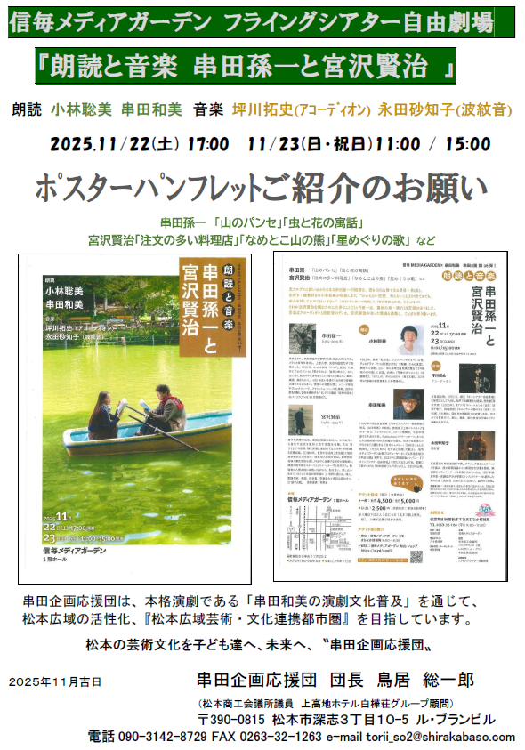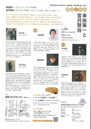 串田企画第26弾!信毎メディアガーデン×串田和美朗読と音楽 串田孫一と宮沢賢治
