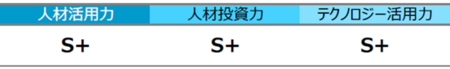 「スマートワーク経営」とは、従業員のウェルビーイングの向上等により人材を最大限活用するとともに、人材投資を加速させることで、新たなイノベーションを生み出し、生産性を向上させ、企業価値を最大化させることを目指す経営戦略です。本調査は2017年から日本経済新聞社が実施しているもので、全国の上場企業と有力非上場企業を対象とし、「スマートワーク経営」の取り組みを、最高5星で段階評価しています。当社グループは、「人材活用力」「人材投資力」「テクノロジー活用力」のすべての分野で「 S+ランク 」の評価を受けました。