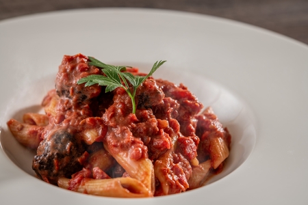 「ポルペッティとペンネのパスタ 赤ワイン香るトマトのクリームソース」