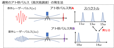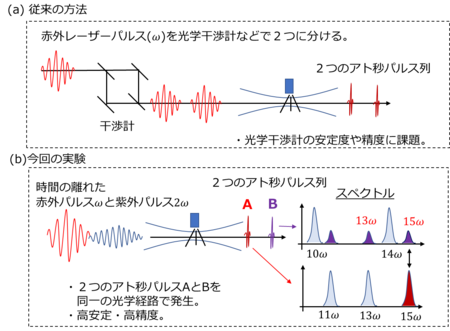 図2.(a)従来の方法。赤外レーザーパルスを2つにわけて、2つのアト秒レーザーパルスを発生させる。(発生したアト秒パルスを2つに分ける方法もある)。(b)今回の方法。赤外レーザーパルス(ω)と紫外レーザーパルス(2ω)を時間的に離し、2つのアト秒パルスを同じ光学系路上で発生させる。このとき、通常のアト秒パルス発生の原理とは異なり、14ωの両端に13ω, 15ωという“余分の”高調波が発生する。この余分の高調波を測定に利用する。