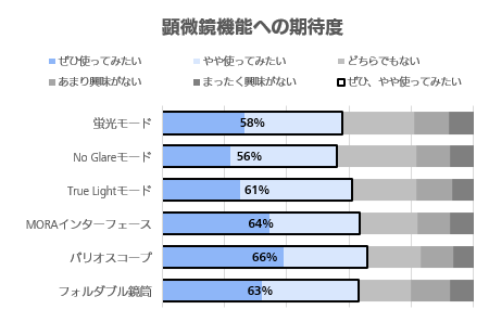 「姿勢と視野の最適化」への関心:身体的負担を軽減し、日常診療の継続性を高めるエルゴノミクス機能に高い関心が寄せらせました。ぜひ・やや使ってみたいという回答は、焦点距離調節で無理のない姿勢が可能なバリオスコープに66%、首や腰への負担軽減が期待できるMORAインターフェースに64%、折り畳み構造により姿勢維持が可能なフォルダブル鏡筒に63%で得られました。
