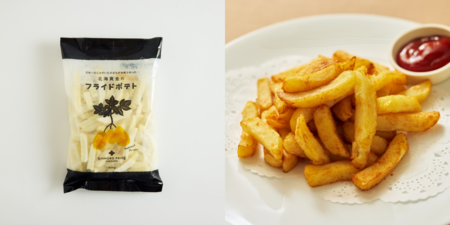 フライドポテトに適した品種「北海黄金」を、収穫後に定温貯蔵庫で熟成し、でんぷんと糖のバランスが最も整う11月中旬の短期間に限定して加工しています。熟成適期や揚げ方など試行錯誤し、外はサクサク、中はマッシュポテトのようなフワフワとした食感と自然な甘味を引き出しました。ご自宅では、少量ずつ、180度の油で約5分間揚げ、軽く塩を振ってお召し上がりいただけます。