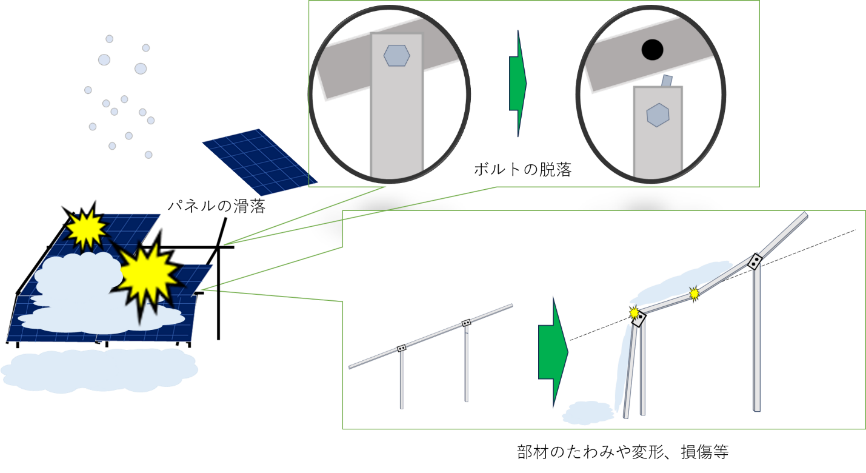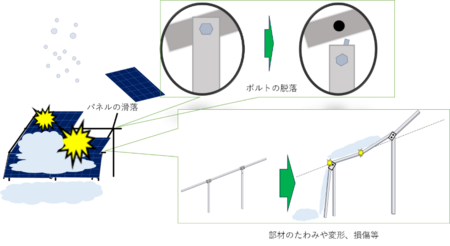 設計基準を上回る50cmの積雪が発生し、更に強風の影響を受けて架台が倒壊したため、太陽電池モジュールの落下に至ったものと推定される。 |
