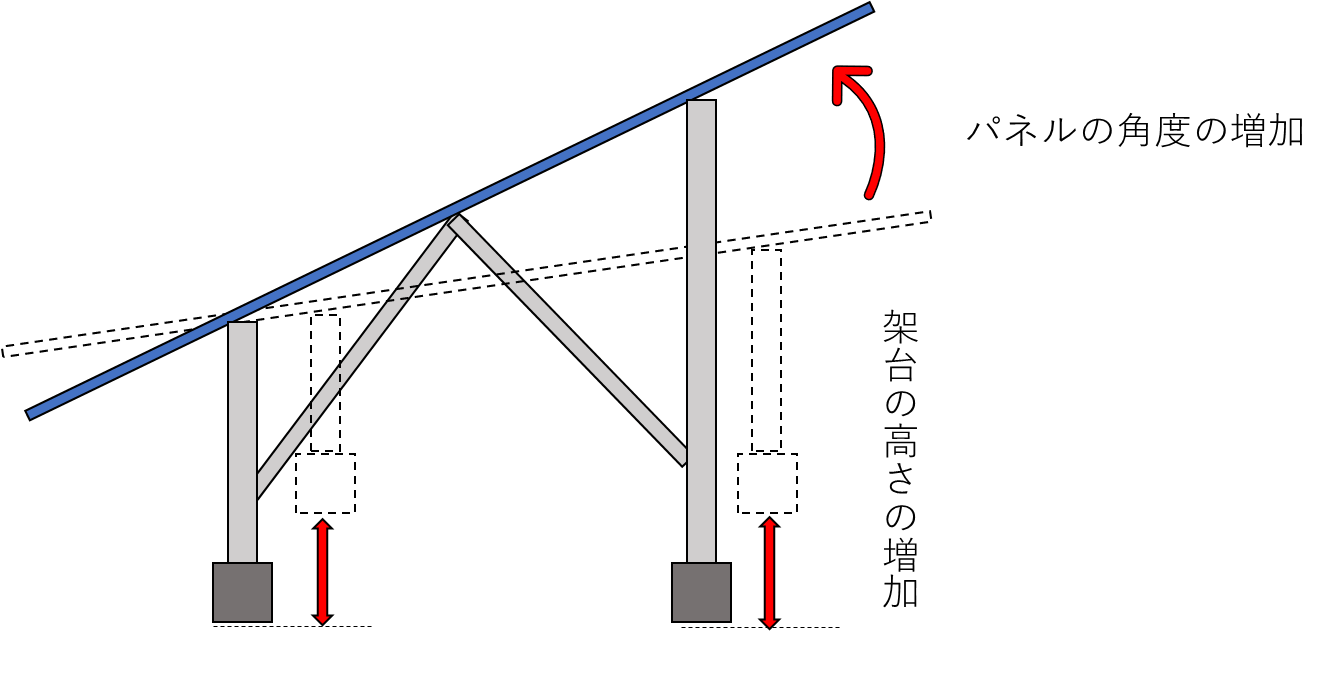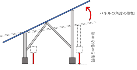 積雪しにくい高さ設計 ・パネル軒先に荷重が集中することを軽減するため、パネルの傾斜角度を大きくする、パネルから落ちた雪が軒先まで達しないよう支柱を長くするなど、パネルから落ちた雪が軒先まで達しないような架台の高さに設計してください(図6)。 |