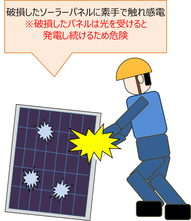 太陽電池モジュールなどの電気工作物が破損した場合 ・太陽電池モジュールなどの電気工作物が破損した場合は、感電する危険性があります(図8)。関係者以外の人が不用意に近寄らないようにする、破損したパネルを速やかに回収するなどの対策を行ってください。 ・復旧作業は、電気主任技術者などの専門知識のある方が、適切な安全装備を身に着けた上で、実施してください。 |