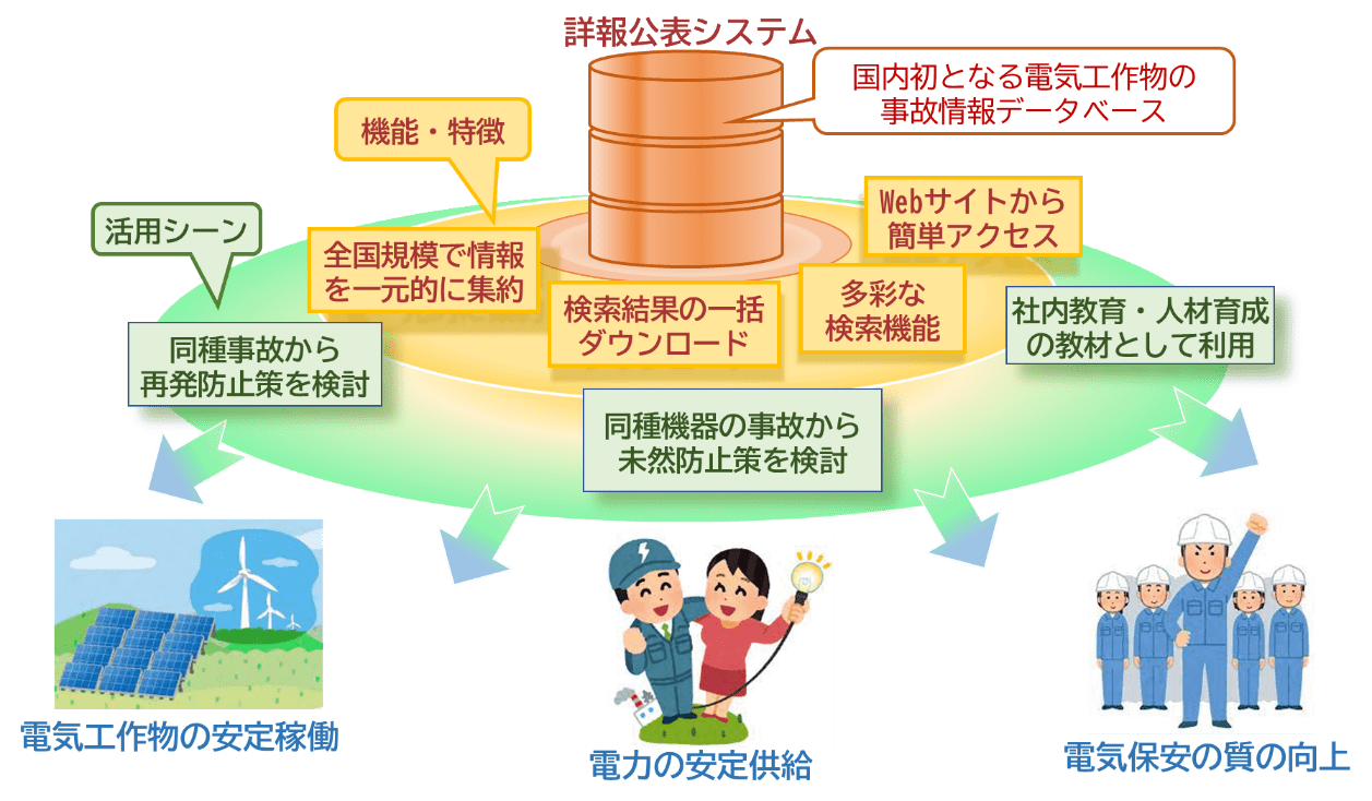 詳報公表システムは、電気事業法に基づく電気工作物に関する全国の事故情報(詳報)が一元化された国内初のデータベースです。2020年度からの事故情報について順次公開を行っております。本システムは、電気事業者をはじめ、どなたでもご自由にお使いいただけます。事故情報を条件やキーワードで簡単に検索することができ、抽出されたデータはCSVファイルとしてダウンロードすることも可能です。