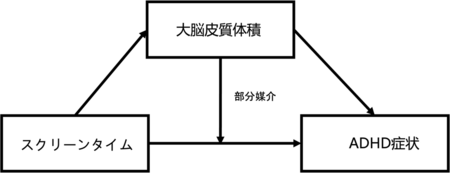 分析では、ベースライン時のスクリーンタイムが2年後のADHD症状および脳構造の変化に与える影響を検討し、さらに脳構造がスクリーンタイムとADHD症状の関係を媒介するかを明らかにするため、媒介分析を実施しました。