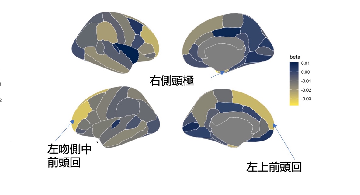 分析の結果、スクリーンタイムが長い子どもほど、2年後にCBCLで測定したADHD症状の得点が高くみられる傾向があり、あわせて脳の一部(右側頭極、左上前頭回、左吻側中前頭回)で皮質が薄くなる傾向があることがわかりました。さらに、脳全体の皮質体積がスクリーンタイムとADHD症状の関係を部分的に仲介(媒介)していることも確認されました。