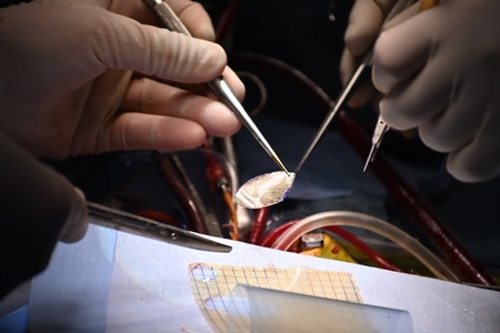 心・血管修復パッチ「シンフォリウム」は、先天性心疾患の手術で使用される医療機器です。吸収性の糸と非吸収性の糸で編んだ特殊な構造のニットに、吸収性の架橋ゼラチン膜を一体化させています。手術によって心臓や血管に縫着された後に、まず架橋ゼラチン膜が、次に吸収性の糸が徐々に分解されながら、非吸収性の糸を含むように自己の組織が形成されることで、先天性心疾患の外科手術後に生じる材料の劣化や、身体の成長に伴うサイズのミスマッチといった課題の解決が期待されています。