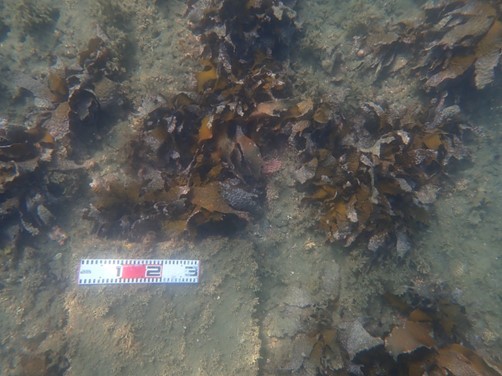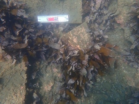 千葉県内房地域ではアラメを対象とし、水深約3mの岩盤に対してセルロースポリマー溶液にアラメ遊走子を混合させ散布を実施いたしました。2024年10月に散布を行い、2025年8月に追跡調査を行ったところ、1平方メートルあたりのアラメ密度は、無散布地点に比べ散布地点では1.78-6.4倍と高い数値が得られました。同地点は周囲にアラメが確認されていることから、天然由来の加入に加え本手法による散布の効果があったものと考えられます。