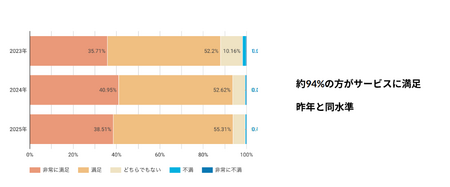 顧客満足度アンケートの結果、リカバリーの訪問看護サービスに「非常に満足」「満足」と回答した方は、2024年同様に約94%となりました。
