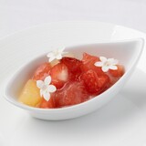 ホワイトチョコレートクリームとビーツのスープが美しい層をなした、甘味と塩味が調和する冷製スープです。仕上げに、ピンクペッパーとホワイトチョコレートをトッピングしました。
