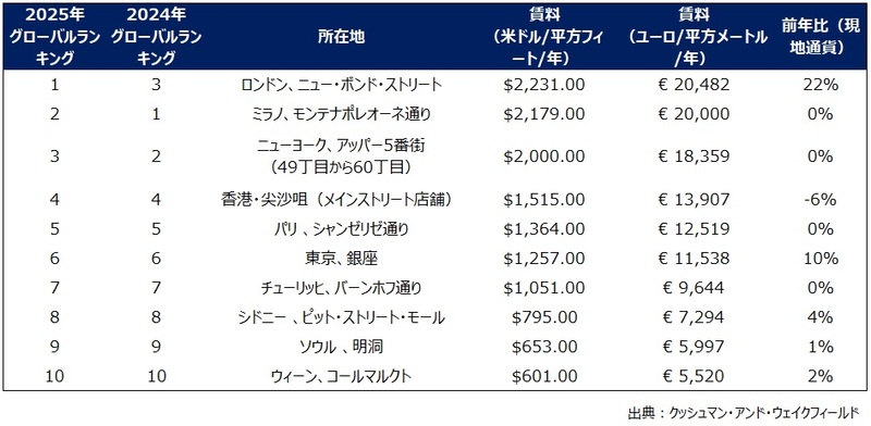 世界のメインストリート2025 リサーチ結果 – 銀座と表参道は、賃料上昇率10%、13%と堅調な伸びを記録