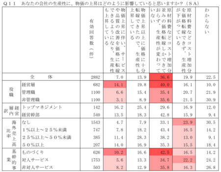 ○ 生産性に対する物価上昇の影響(Q11については、「原材料費などコスト増加分並みの価格転嫁しかできておらず、生産性が変わっていない」(36.6%)が最多。「物価上昇に伴い、サービスや品質の改善を価格に転嫁できるようになり、生産性も上昇している」という、環境変化を好機として捉える回答は、全体では7.0%だが、経営層(14.1%)やものづくり(10.2%)では比較的多くなっている。(P.7)