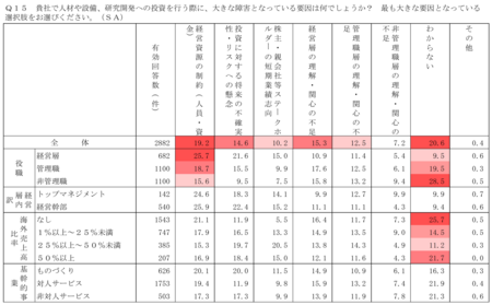 ○ 人材や設備、研究開発投資の障害となっている要因(Q15については、「わからない」が20.6%で最も多く、「経営資源の制約(人員・資金)」が19.2%と続く「経営資源の制約(人員・資金)」は経営層で最も多く、役職が上がるほど回答が多い。(P.12)