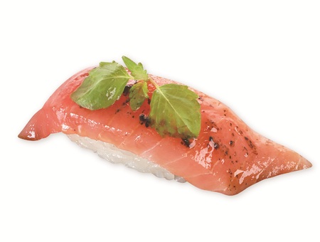 濃厚な脂の旨みが楽しめるミナミマグロの中トロを特製タレに漬け、醤油を加えたトリュフソースをかけることで、脂の旨み、トリュフの香りとコクがバランスよく楽しめます。ペリーラ(大葉のベビーリーフ)の爽やかな風味を添えることで、濃厚ながらもさっぱりと、もう一皿手を伸ばしたくなるような味わいの逸品です。
