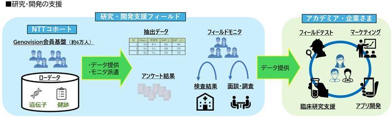 NTTコホートによるサービス「研究・開発支援モデル」では、Genovision会員へのリコンタクトが可能です。再同意を取得したうえで、遺伝子情報・健診情報・追加アンケート結果などを提供できます。また、フィールドモニタとして追加検査や面談を実施することも可能です。