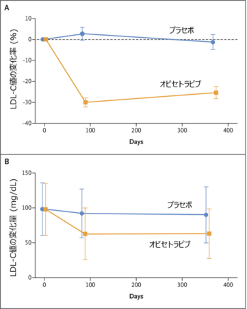 LDL-Cは29.9%低下(Obicetrapib群) vs 2.7%上昇(プラセボ群)
