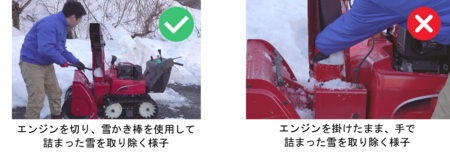 ○雪詰まりを取り除く際はエンジンを切り、雪かき棒を使用する。