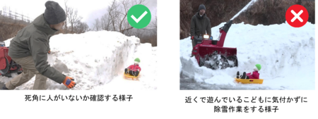 除雪作業をする際は、周囲に人がいないことを確認してください。特に背丈の低いこどもは死角に入りやすいので、十分気を付けてください。また、除雪機のエンジンを掛けたままその場を離れると、こどものいたずらなど、思わぬ事故につながるおそれがあります。一時的にその場を離れるときでも、必ずエンジンを切ってください。