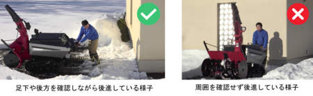 後進する際は、足下や後方の障害物を確認し、十分注意して走行してください。転倒して除雪機の下敷きになったり、障害物に挟まれたりするおそれがあります。
