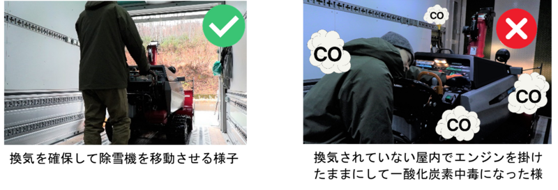 作動中の除雪機の排気には一酸化炭素が多く含まれています。一酸化炭素は無色・無臭で、発生に気が付きにくく、また非常に毒性の強い気体です。閉め切った屋内で除雪機のエンジンを掛けたままにすると、短時間で一酸化炭素の濃度が高くなり非常に危険です。除雪機は始動/停止も含め風通しの良い屋外で使用しましょう。エンジンを切った状態で、手で押して移動できない大型の除雪機等の場合は、窓などの開口部を開放して十分な換気が取れていることを確認してから、「屋内で始動し速やかに屋外に出る」、「屋内にしまったら速やかにエンジンを切る」などの対策をしてください。