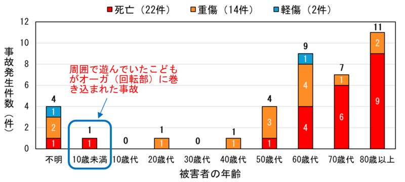 除雪機により人的被害があった事故38件について、「年齢別の事故発生件数」を図4に示します。被害者の多くが高齢者となっています。これは、豪雪地帯における除雪作業者の高齢化により、高齢者の除雪中の事故が増えているものと考えられます。事故に遭わないよう使用者本人のみが気を付けるだけでなく、離れて暮らしているご家族や周りの方々のサポート・お声がけもお願いします。