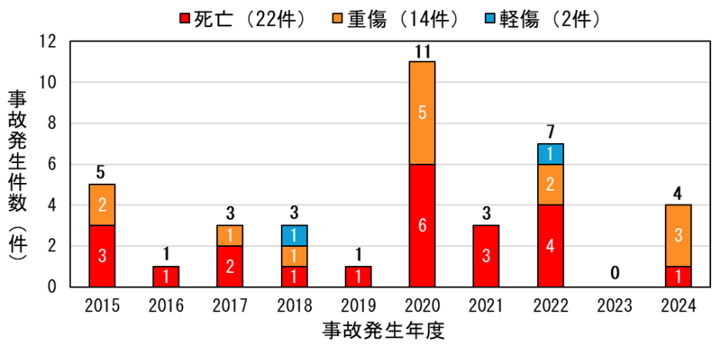 2015年度から2024年度までの10年間にNITEに通知された製品事故情報(※2)では、除雪機により人的被害があった事故は38件ありました。事故件数の推移を見ると、降雪量が全国的に平年より少なかった2023年度は事故が0件だったのに対し、平年並みか多かった2024年度は再び事故が発生しました。