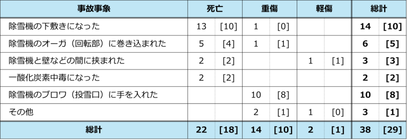 除雪機により人的被害があった事故38件について、「事故事象別・被害状況別の事故発生件数」を表2に示します。死亡事故は「除雪機の下敷きになった」、「除雪機のオーガ(回転部)に巻き込まれた」の2つの事象で多く発生し、重傷事故は「除雪機のブロワ(投雪口)に手を入れた」事象で多く発生しています。