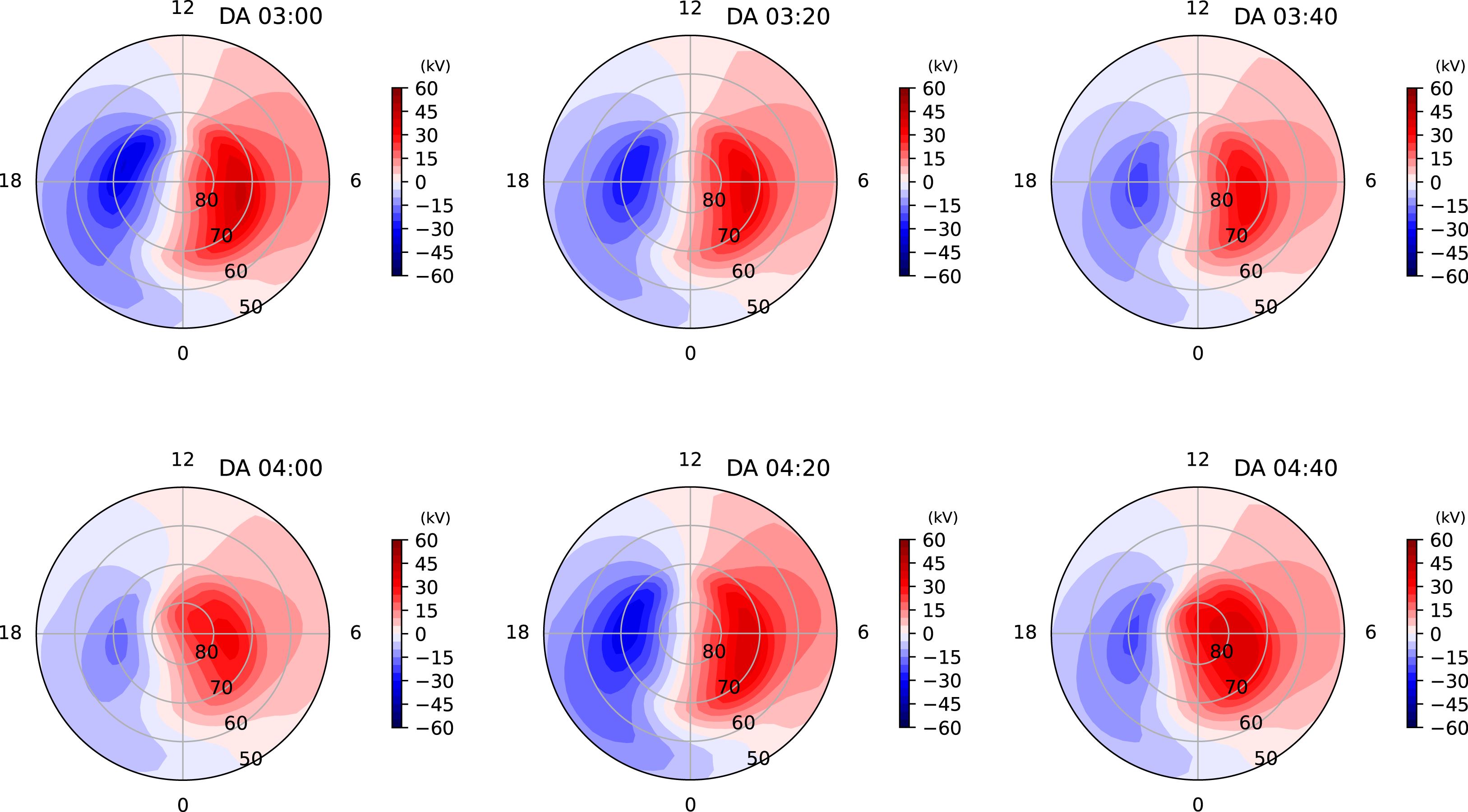 図1 エミュレータにデータ同化を適用して推定された2017年3月27日の3:00~4:40 UTの20分ごとの極域電離圏電場ポテンシャルの分布