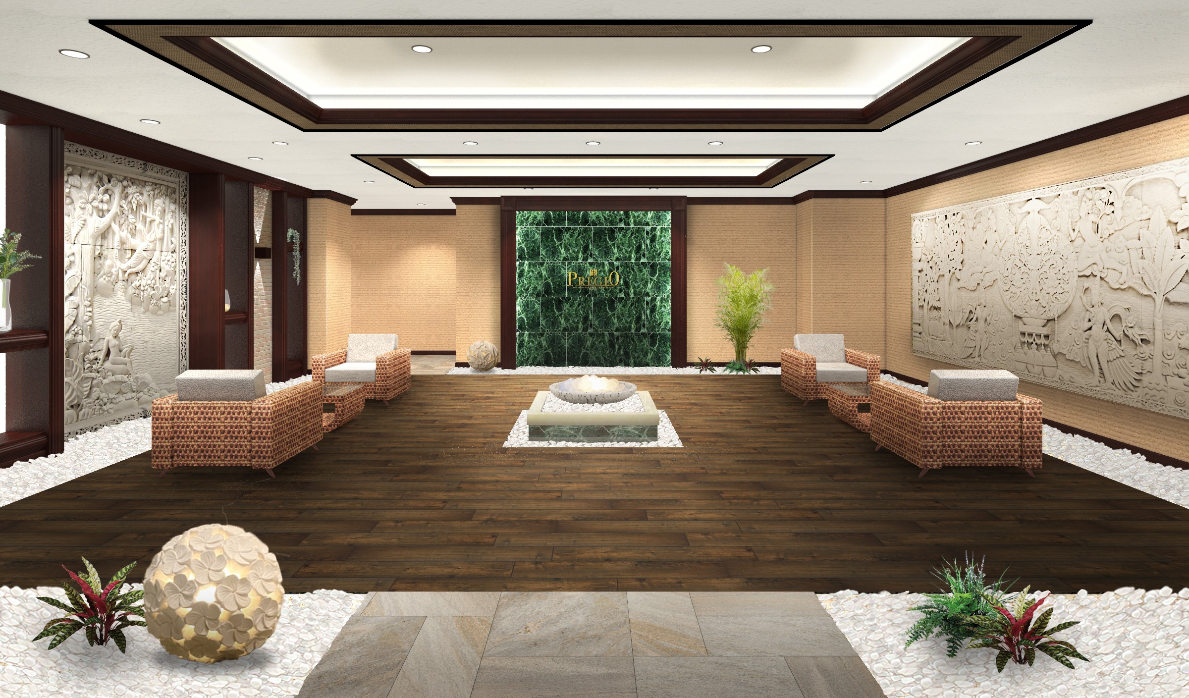 エントランスホールは、アジアの南国リゾートをイメージしデザインしております。木調のフローリングが醸し出す温もりと、壁面に施された緑の大理石が放つ重厚感が、訪れる人を上質な空間へと誘います。両側にはラタン調のソファをゆったりと配し、くつろぎの時間を提供します。さらに、壁面に施されたストーンカービングが、異国情緒あふれる南国リゾートの雰囲気を一層際立たせてくれます。