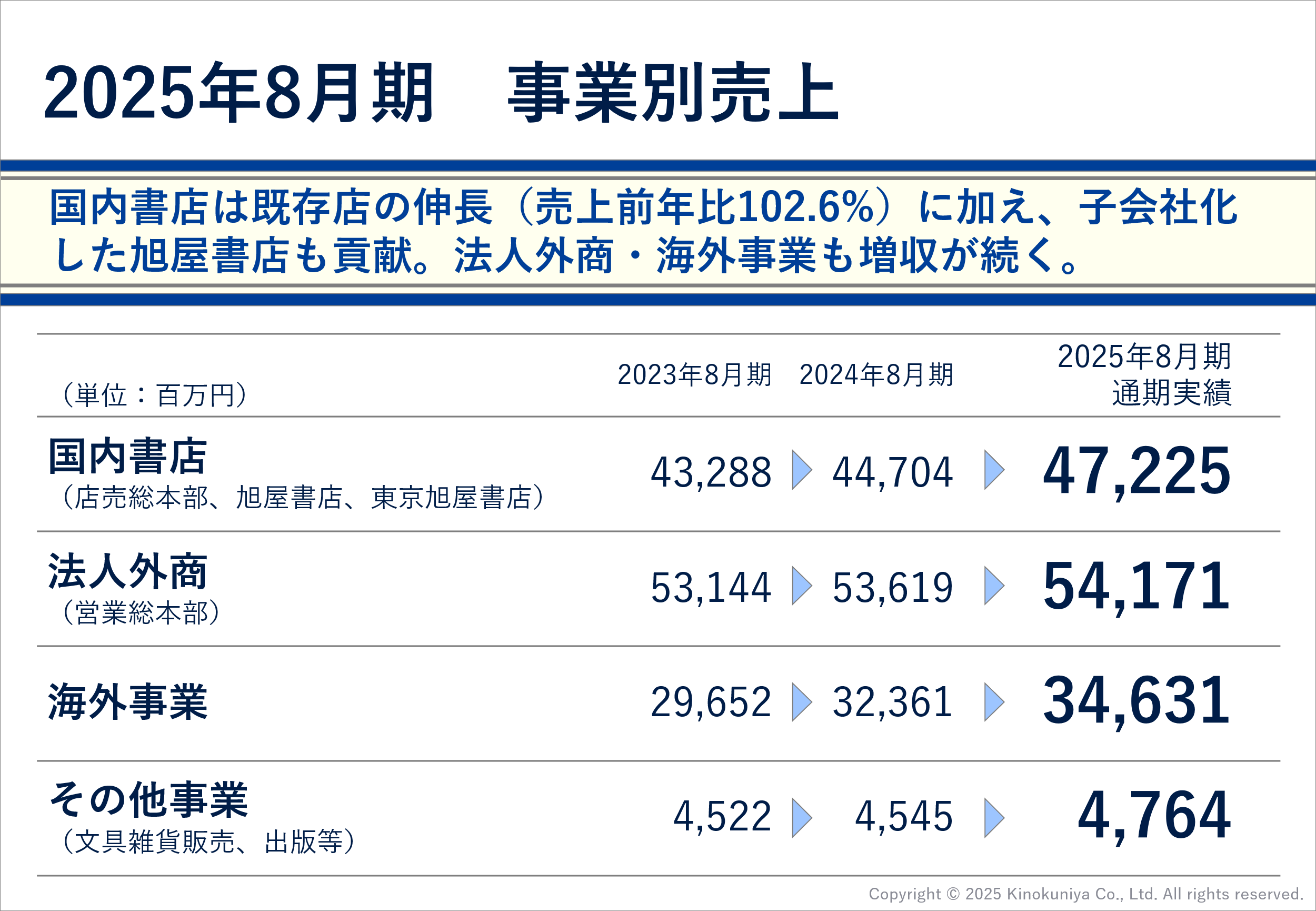国内書店事業は、既存店(店売総本部)売上がプラスとなったほか、昨年12月に完全子会社化した旭屋書店・東京旭屋書店の一部売上も加わって472億円となりました。法人外商事業、海外事業も売上伸長が続いており、3年続けて主力3事業が揃って増収となりました。