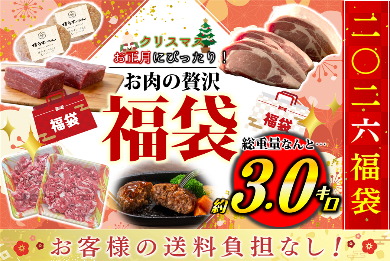 クリスマスからお正月に大活躍するお肉を集めました。商品総重量はなんと約3.0kg。この福袋があれば素敵な年越しが出来ること間違いなしです。