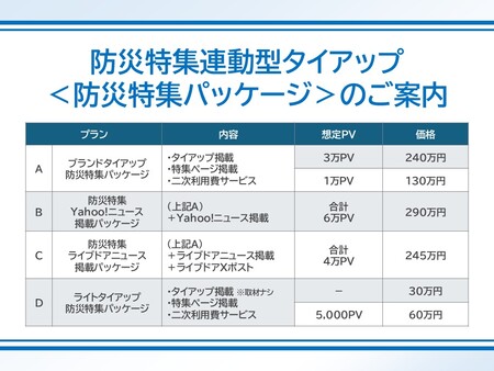 防災関連商材・サービスのブランディングに適した編集記事を制作し、Yahoo!ニュースなど外部メディアへ同時掲載可能なコラボパッケージも用意しています。