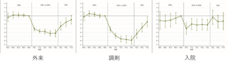 「外来」「調剤」「入院」にかかる医療費に分けてみてみると、「入院」医療費への影響は、「外来」と「調剤」に比べると半分程度でした。2割負担の人たちの医療費は1割負担の人たちに比べて、「外来」で4%、「調剤」で3~6%、「入院」で2%減少しました(図1)。
