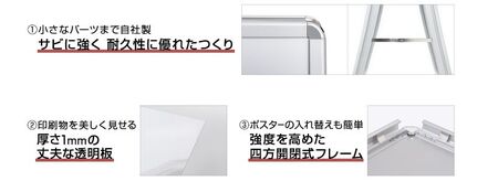 簡単にポスターの入替えができる四方開閉式フレームに強度を持たせ、耐久性と使いやすさを両立。