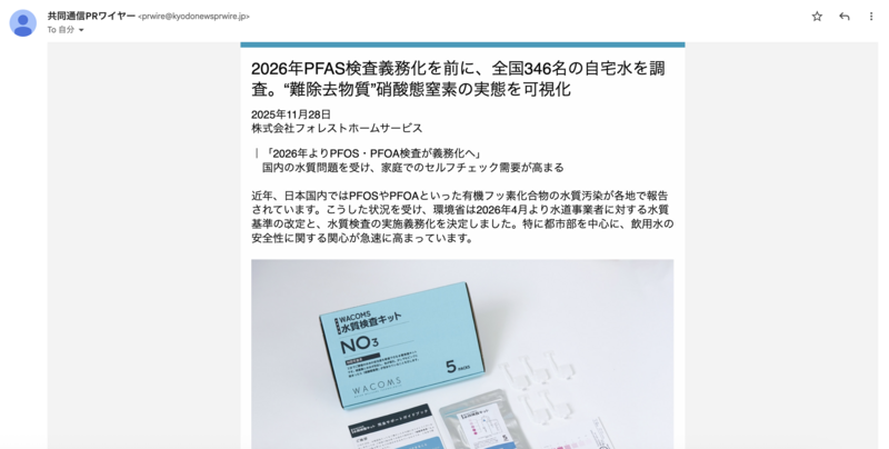 また、メールを開封するとタイトルだけでなく、プレスリリースの全貌が把握できる構成のため、広報担当者が届けたい情報が埋もれにくく、届けたいメディアへ届く可能性を高めます。こうした仕組みにより、発信内容が記者の目に触れる機会を確保しやすくなり、結果として記事化の機会創出にもつながります。
