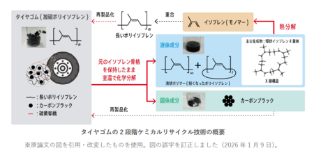 国立研究開発法人 産業技術総合研究所(以下「産総研」という)化学プロセス研究部門 上田 善弘 主任研究員、Wahyu S. Putro 主任研究員、松本 和弘 研究グループ長、触媒化学研究部門 竹内 勝彦 主任研究員、崔 準哲 総括研究主幹、材料・化学領域 深谷 訓久 研究企画室長(化学プロセス研究部門付)らは、株式会社 ブリヂストン(以下「ブリヂストン」という)と共同で、タイヤに使用される加硫ポリイソプレンゴムを温和な条件で化学的に分解し、さらに熱分解と組み合わせることで、タイヤ原料を回収するケミカルリサイクルの技術を開発しました。