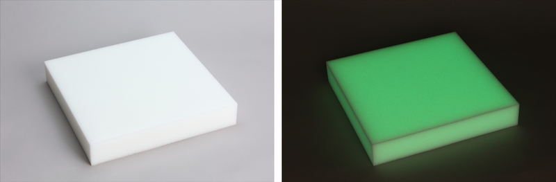 ■業界初の蓄光機能付き軟質ウレタンフォーム サイズに関係なく、光※を当てた部分に蓄光し、暗所で発光する業界初の軟質ウレタンフォームです(特許出願済)。 ※太陽光や蛍光灯、スマートフォンのライトなど紫外線領域が含まれている光。 |