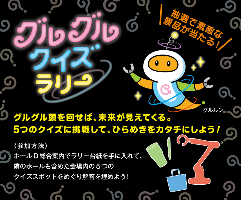 ホール間を相互に行き来できる形になっており、それぞれのイベントに設置しているクイズスポットを巡ると、抽選で素敵な景品が当たる「グルグルクイズラリー」も実施します。ぜひ、同時開催イベントも含めて、ロボットやモノづくりに触れて、お楽しみください。