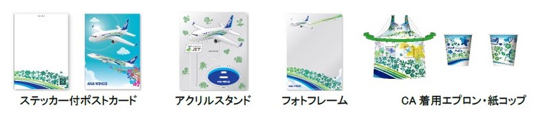 CAが着用するエプロンと、ドリンクサービスに使用する紙コップが特別デザインのものとなるほか、ステッカー付ポストカードはご要望に応じて提供、アクリルスタンドとフォトフレームは、撮影用として機内でお客様ご自身でお楽しみいただけるよう貸出をいたします。