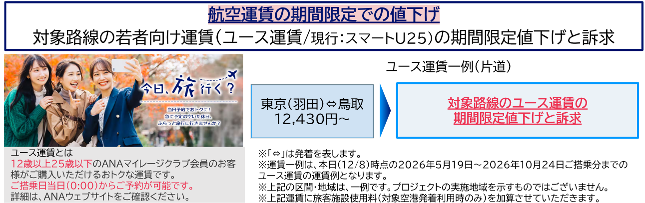 1.地域✕お客様✕ANAをつなぐ、新たな地域活性化の取り組み「ANAつなぐふるさとプロジェクト」始動 2.地域創生特別デザイン機「ANAふるさとJET」就航 3.新規登録者限定!「ANAのふるさと応援ダブルキャンペーン」開始 |
