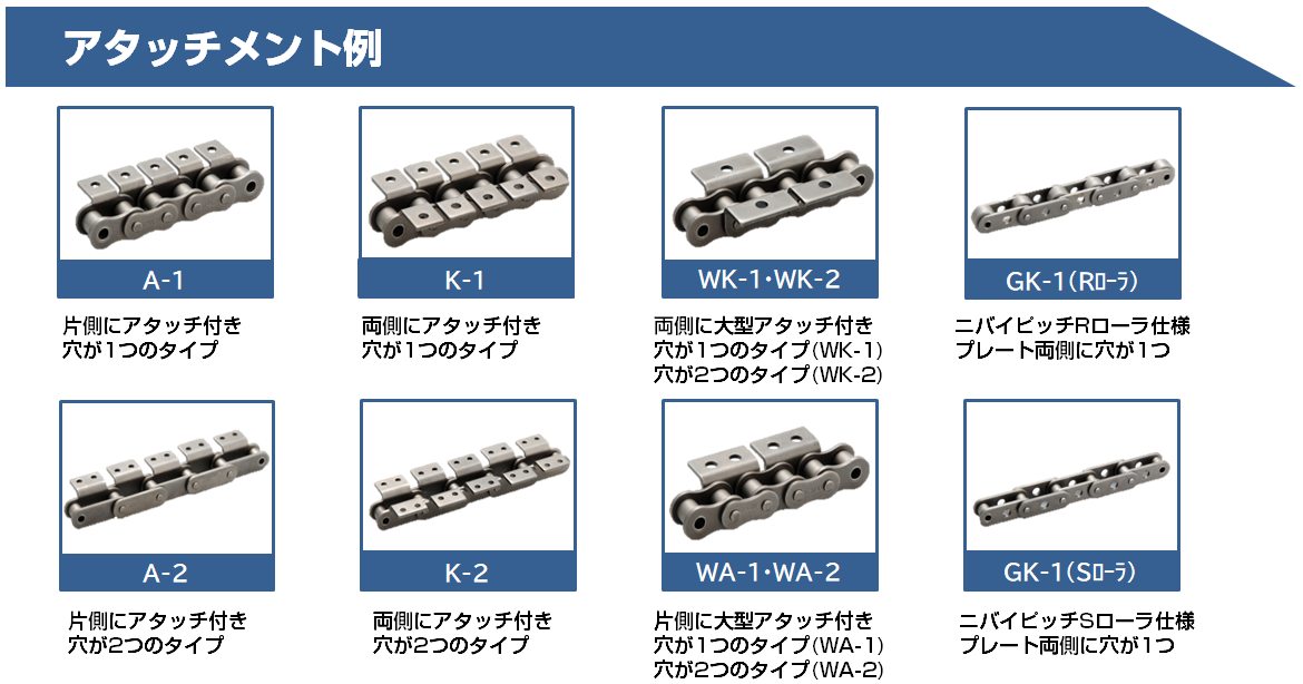 アタッチメント付きローラチェーン各種 (A・K・WA・WK・GKタイプ) |
