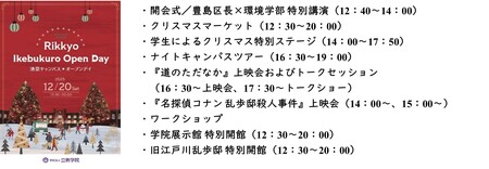 立教大学の冬の風物詩であるクリスマスイルミネーションのもと、地域の方々をはじめとする、立教学院に集う全ての人々を対象に、“立教のクリスマス”をテーマにした多彩なプログラムを実施します。国際色豊かな飲食の販売を行う「クリスマスマーケット」をはじめ、幻想的なキャンパスを学生のガイドで巡る「ナイトキャンパスツアー」、2026年4月に池袋キャンパスに新設される環境学部に関する講演会、特別映画上映会など、立教ならではの特別なプログラムを多数ご用意しています。楽しみながら立教の雰囲気を感じていただける、この日限りの特別なイベントです。皆さまのお越しをお待ちしております。