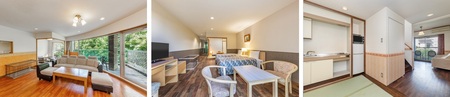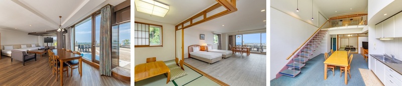 左:ドッグフレンドリールーム プレミアム和洋室、中:ドッグフレンドリールーム スタンダード和洋室