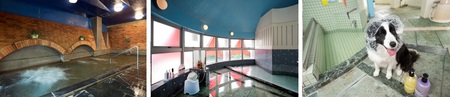 左:大浴場、中:貸切風呂、右:ワンちゃんと一緒に入れる貸切風呂